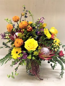 Fall in love with this beautiful arrangement made with roses, protea dahlia, delphinium and greenery . Deluxe as shown.
