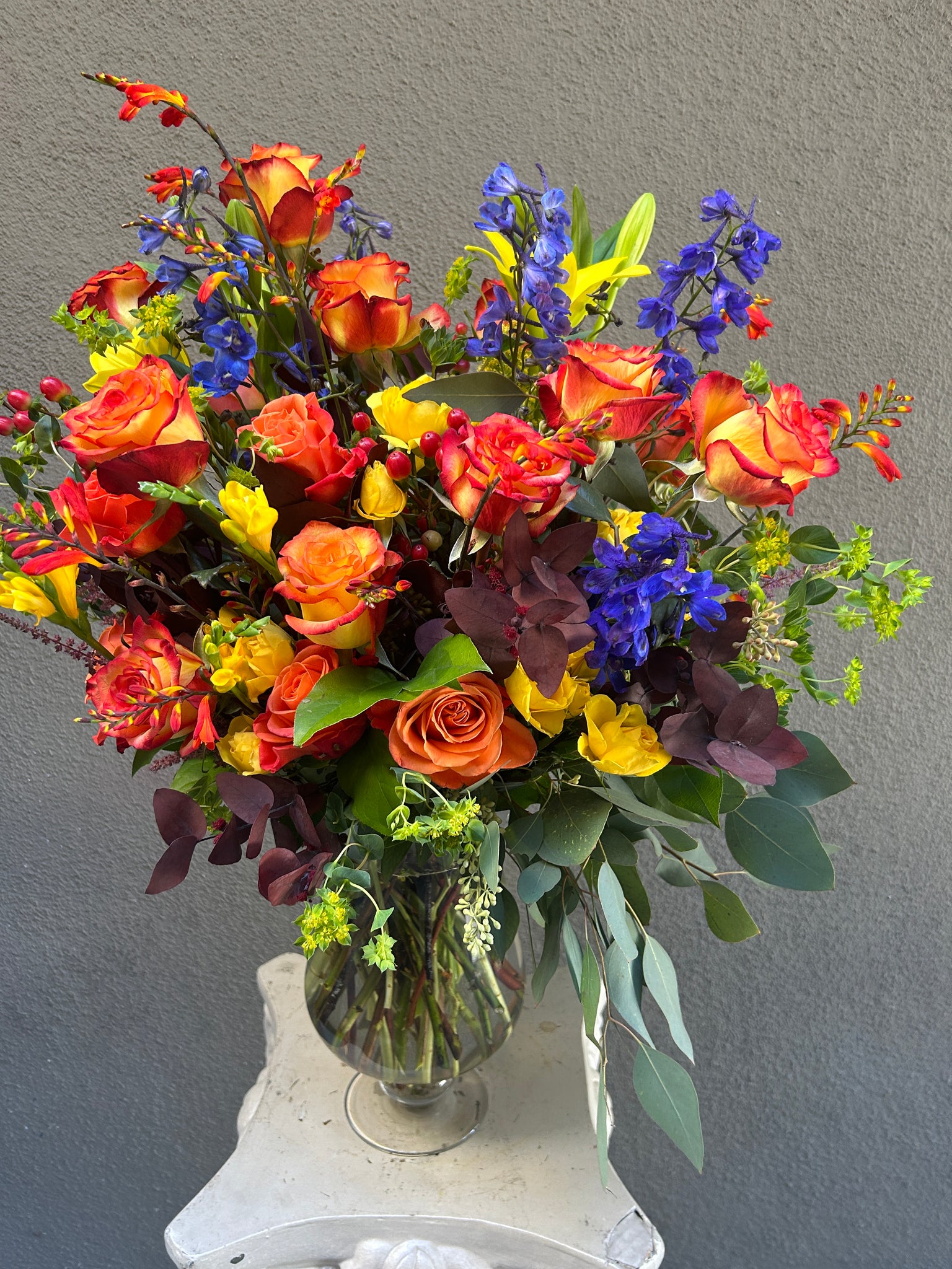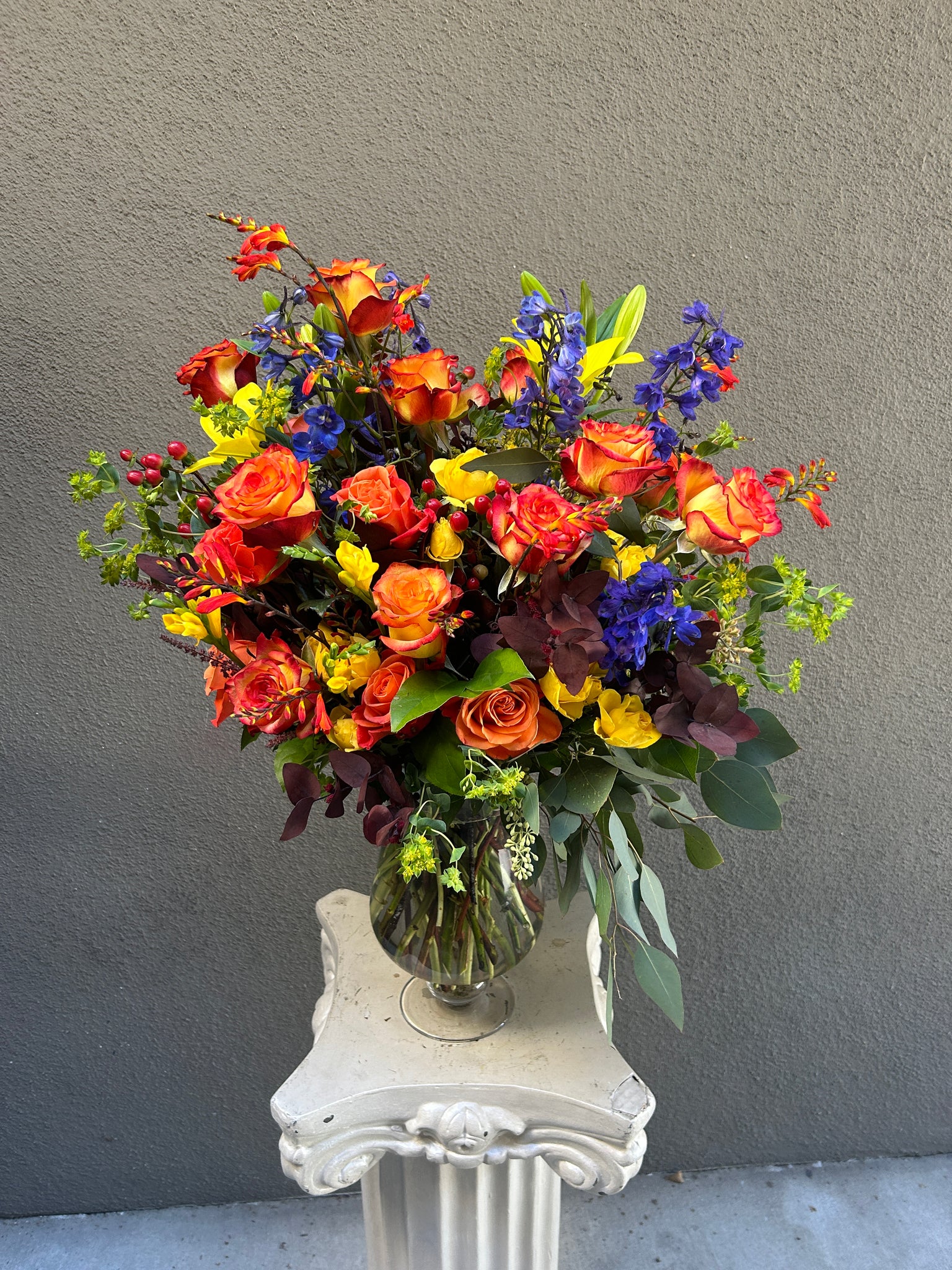 Enjoy this colorful mix of orange roses and seasonal flowers. Perfect for birthday, thank you or just because. (Flowers will vary based on season and availability)
