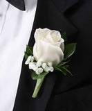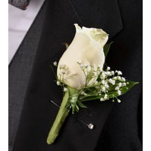 White Rose boutonniere, accented with wax flowers or baby breath and greenery. Customize the ribbon colors to match your outfits!