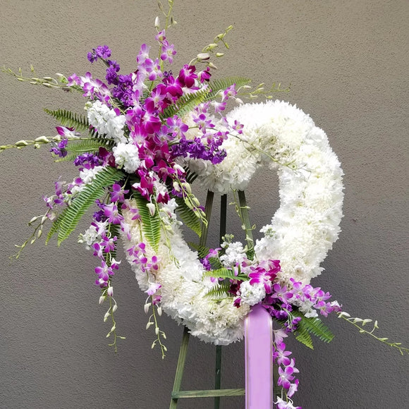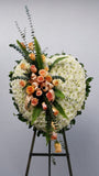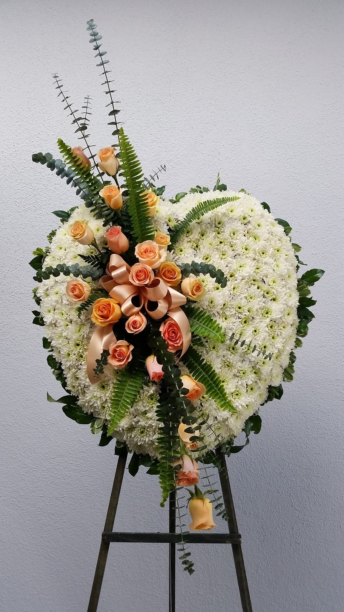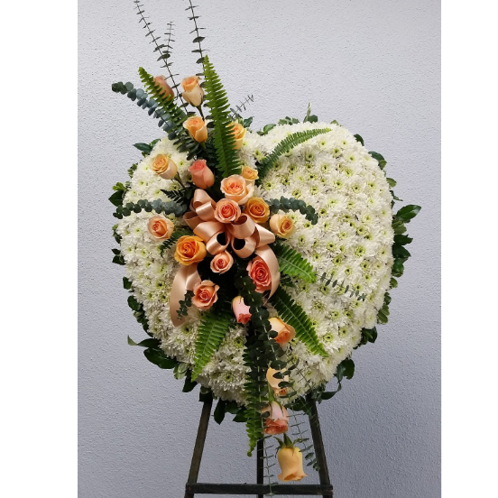 This elegant solid heart wreath features a white mum foundation finished with a spray of peach roses.