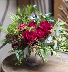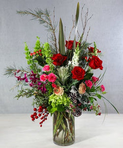 Christmas arrangement made with red roses, green carnations, tulip ,hypericum and winter greens.  Deluxe as shown.