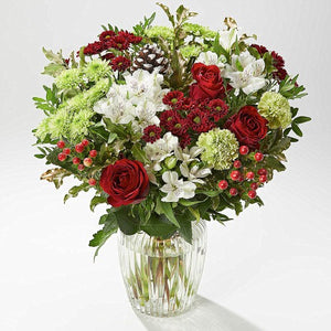 This modern holiday arrangement will light up the house of the person who receives this delightful gift. It features red and white flowers with winter greens in clear glass vase .
