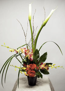 The Calla Lily Celebration is an architectural design made with tall calla lilies, red roses and purple dendrobium orchids accented with tropical horsetails and sleek greenery. Arranged in a modern vase.