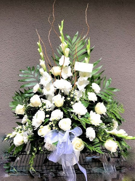 This stately sitting spray is composed of two dozen red roses arranged with bold greenery.  Approximately 27" W x 26" H.