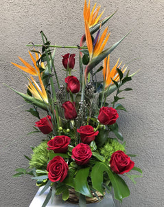 Featuring Rose and Bird of Paradise with mixed greenery.