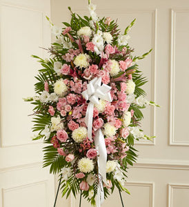 This beautifully balanced spray features a mix of roses, chrysanthemums, carnations, lilies, gladioli and other blooms on a bed of fresh greens. Finished with a centered white bow for a special touch. Better (as shown) measures approximately 58"H x 29"W, including easel.