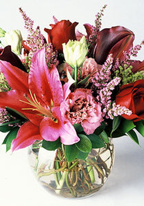 A wonderful gift for all occasions, this dainty yet high end arrangement combines pink stargazer lilies, burgundy calla lilies, red roses and pink lisianthus perfectly arranged in a glass bowl or vase.