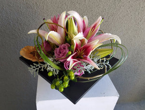 The Lily Garden is an eye-catching arrangement, made up of a collection of pink stargazer lilies, hypericum berries, and lavender roses gingerly adorned with curly willow branches and placed in a contemporary square black container.  Deluxe as shown.