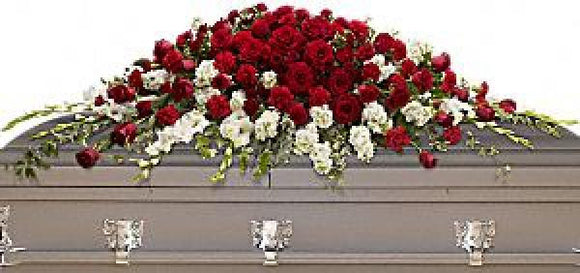 Red roses and carnations are paired with snow white gladioli and stock, and accented with greens including variegated ivy and salal to create a grand and memorable spray. Deluxe (shown) is approximately 75" W x 25" H.