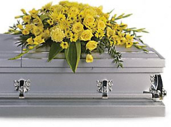 An array of brilliant yellow roses, gladioli and chrysanthemums contrast with peaceful greens including Italian ruscus and aspidistra leaves. Deluxe (shown) is approximately 44" W x 22" H.