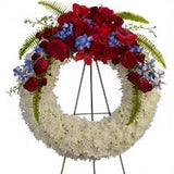 A distinctive sympathy wreath of traditional flowers such as red roses, red carnations, bright white chrysanthemums and delphiniums.