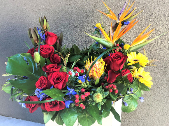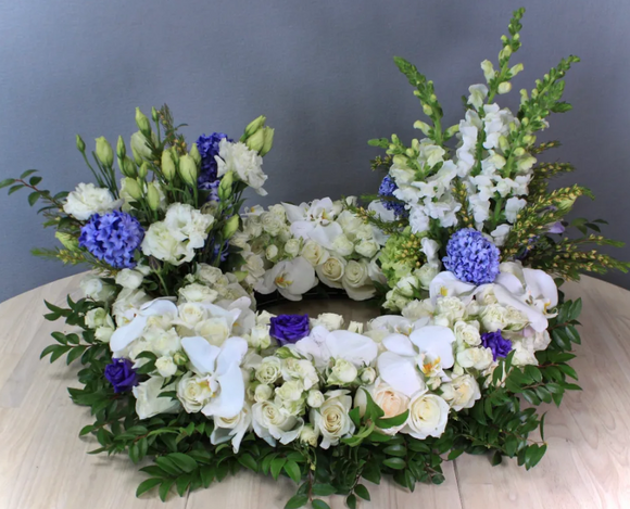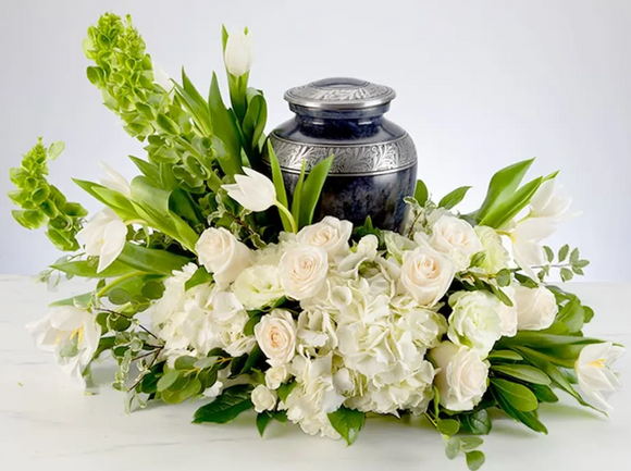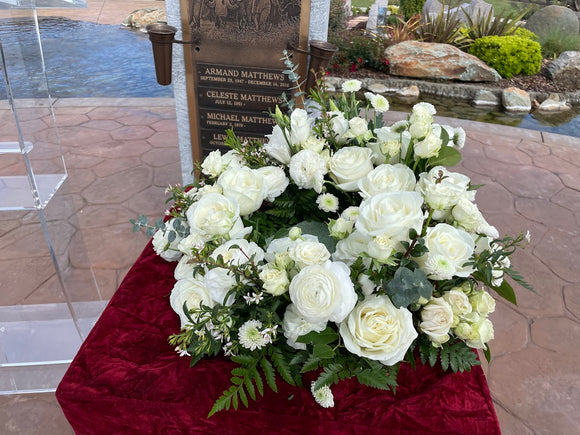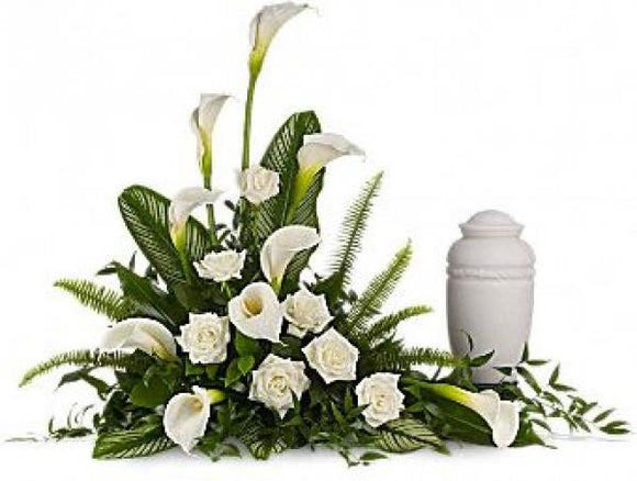 This beautiful urn spray of graceful calla lilies and white roses is accented with rich tropical greenery including Italian ruscus, salal, calathea leaves, sword fern and aspidistra leaves.