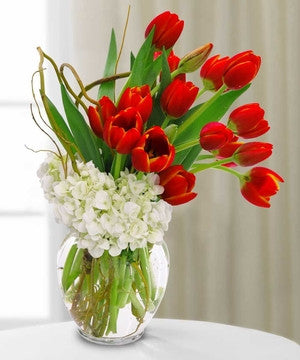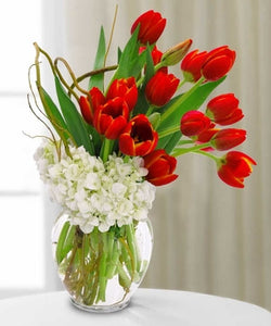 This bountiful arrangement of tulips and hydrangea makes a perfect gift.  Red-orange tulips are made even bolder when contrasted with white hydrangea.  The flowers are arranged in a glass ginger-jar vase and accented with curly willow.