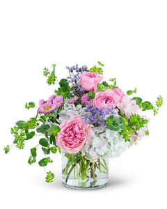 A soft and delicate arrangement of roses of pastel hues with the accent of orange will touch her heart. Featuring roses, hydrangeas and seasonal bloom and greenery delicately arranged in a designer container.