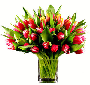A collection of hot pink, and variegated red and yellow tulips create a radiant display.