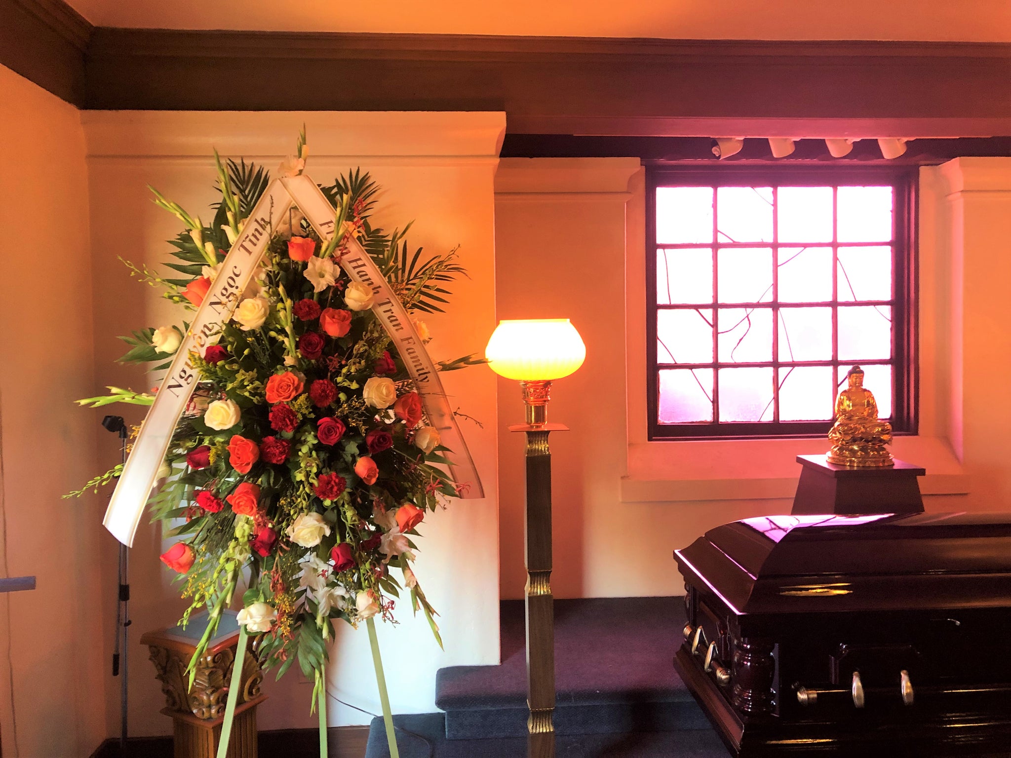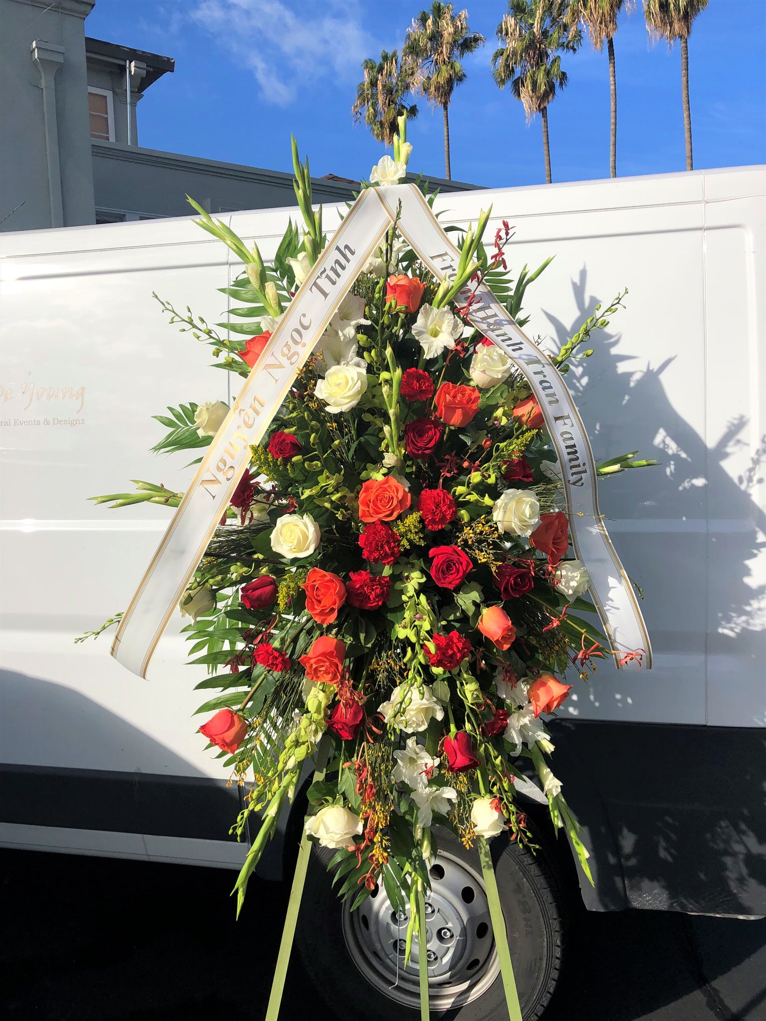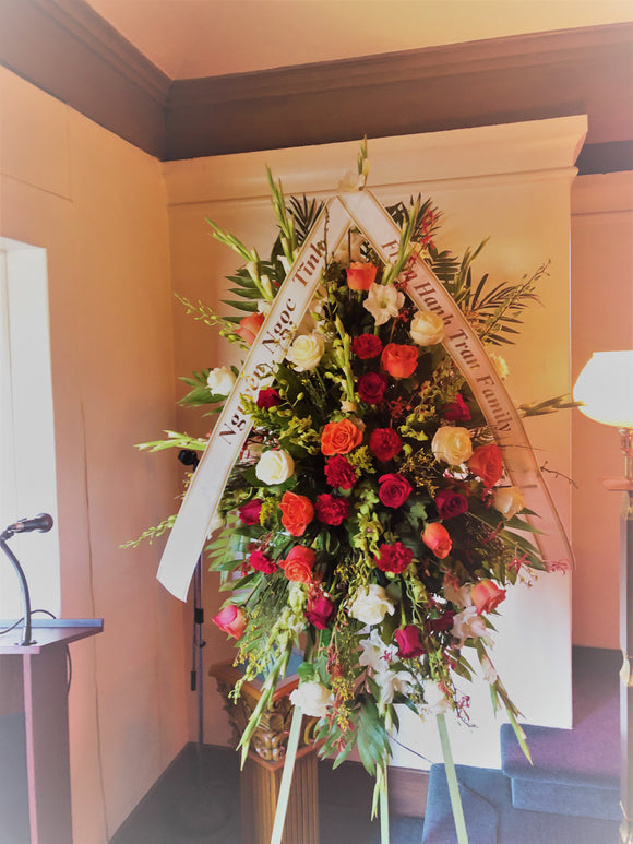 Large size standing spray. Featuring gladiolus, Dendrobium Orchid, Delphinium, Lily, Rose, Mini Rose, Larkspur with mixed greenery.