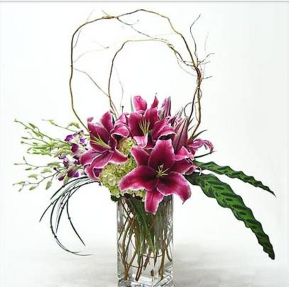 Stargazer lilies are paired with orchids for a rich and elegant statement piece. It's then finished with curly willow branches and fresh greens.