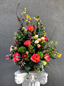 Natural, elegant style in basket showing long friendship., featuring roses, mini roses, hypericum, matsumoto, etc with mixed greenery.