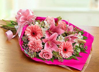 This special pink bouquet features fresh pink lilies, gebera daisies, carnations and roses beautifully wrapped in pink wrapping. Finished with a sweet pink bow.
