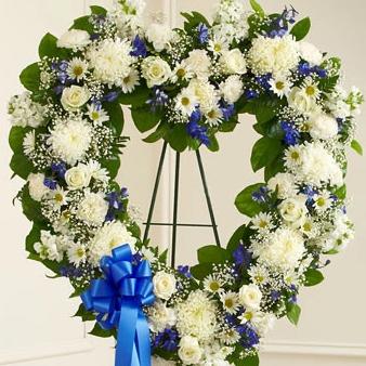 This peace loving open hear wreath filled with various white mums, baby breath, white roses and thoughtfully scattered blue bella donna. Finished with a blue ribbon and a fresh greenery frame. Deluxe as shown (Includes stand).