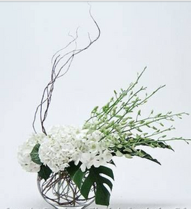 For a bright, refreshing statement piece, enjoy this modern, contemporary arrangement featuring white hydrangeas, orchids, branches and foliage. Deluxe as shown.