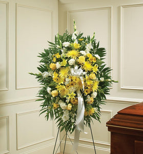 This bright, beautifully balanced spray features a mix of chrysanthemums, roses, carnations, lilies, mums, gladioli and more on a bed of fresh greens. Finished with a white bow for a special touch. Better (as shown) measures approximately 55"H x 24"W, including easel.