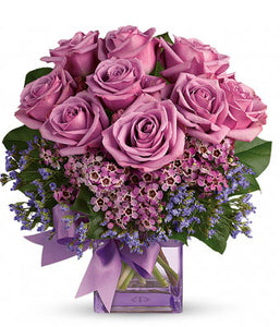 A dozen lavender roses in a contemporary clear vase, includes smaller purple flowers and a cute bow.